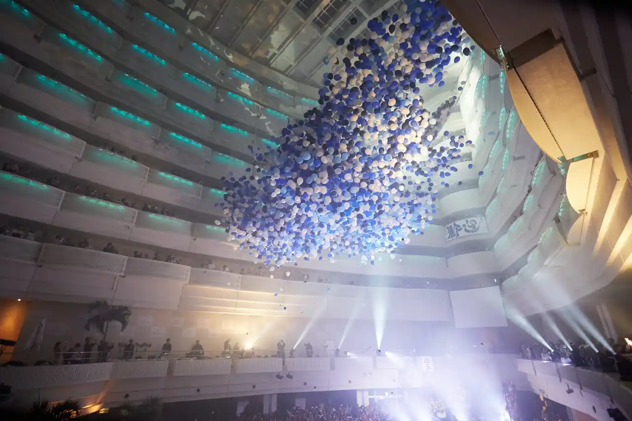 ■ カウントダウン直後の花火とバルーンシャワーが彩るドラマティックな瞬間 |