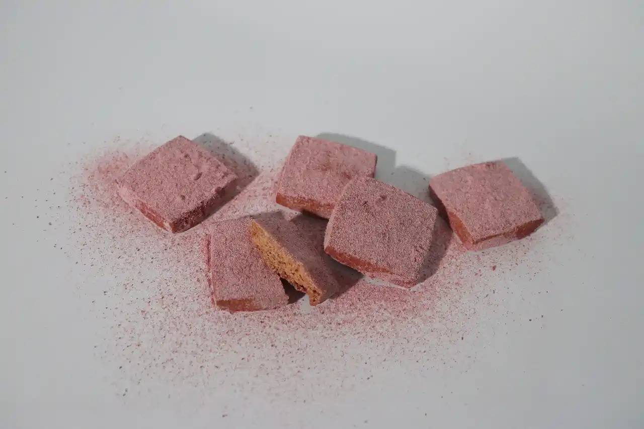 サクッと軽い生地のまわりをフランボワーズとバニラのパウダーで包み、酸味とやさしい甘さが重なり合う、すっきりと上品な後味の一枚です。 |