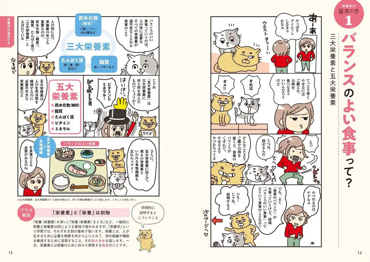 これから栄養と健康について学ぼうとするすべての人へ向け、栄養学の基礎知識から最新トピックまでを網羅し、マンガと図解を多用して解説した本です。案内役は2匹のネコ。第1章と第2章は、主人公と2匹のネコの掛け合いにより、知っているようで意外と知らない食と栄養の知識がぐんぐんと身につく作りです。 |
