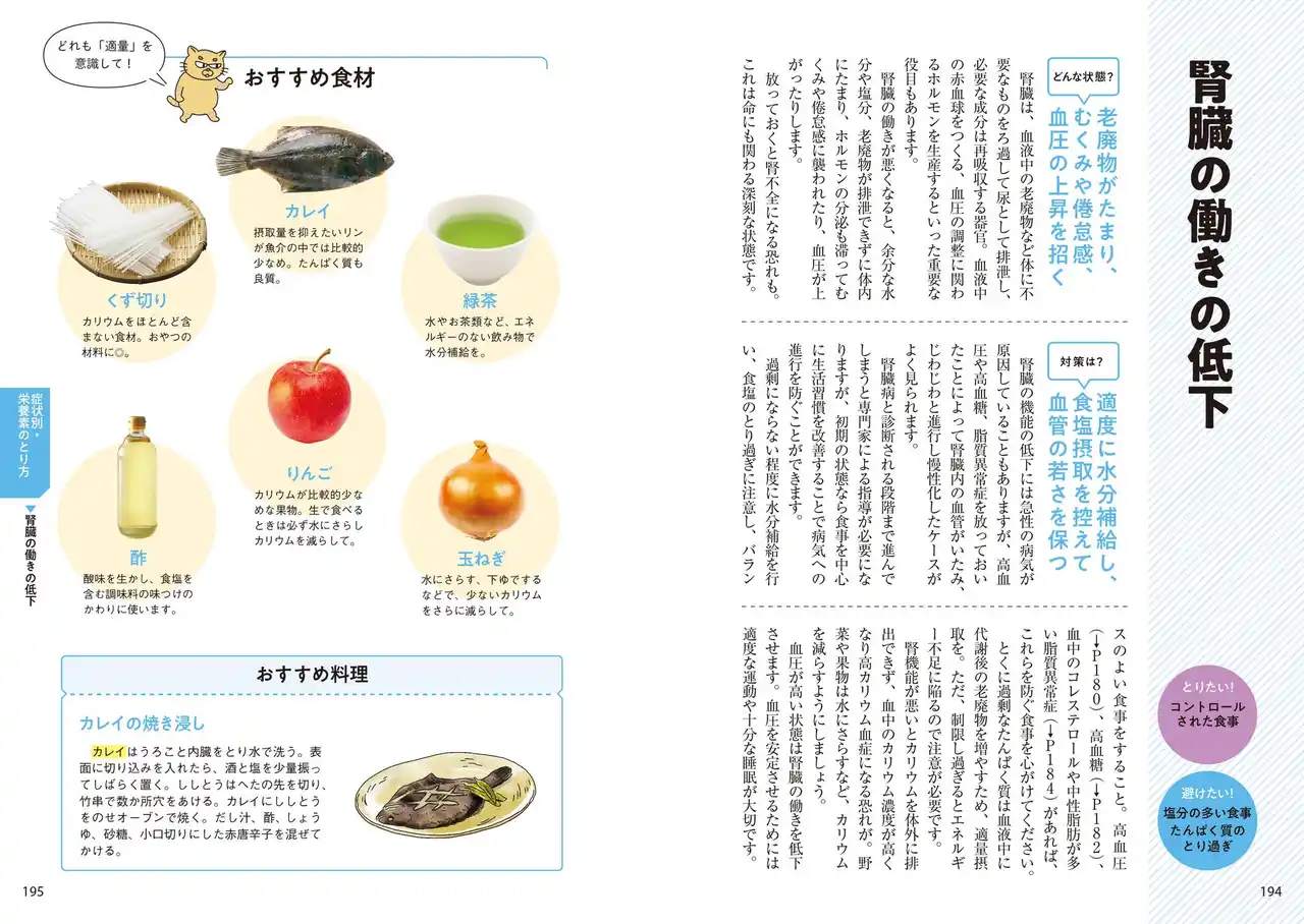続く第3章では各栄養素の効率のよい食べ方、第4章では症状別のおすすめレシピ、第5章では食品ごとの栄養成分や栄養を逃さない調理法と、栄養知識を毎日のごはんに活かすための情報も満載。 |