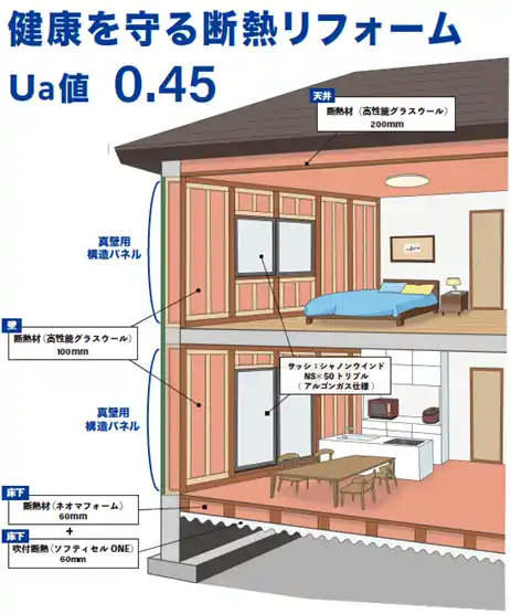 リフォームでありながら、新築トップクラスの性能を追求。既存住宅を以下の水準へと引き上げました。 |