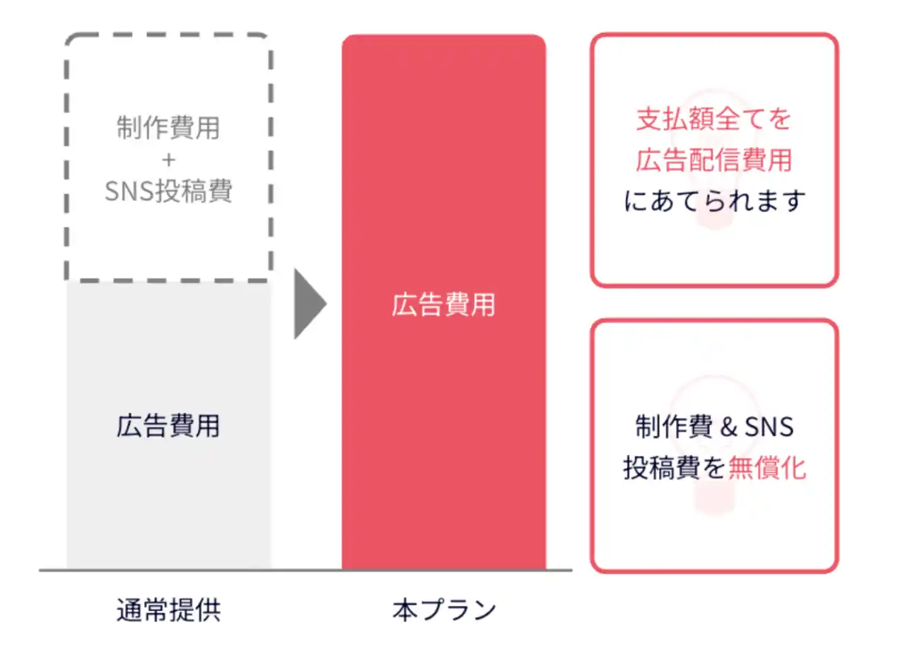 制作・投稿費が実質無償:X広告配信費を一定金額以上ご発注いただくことで、動画制作費用やSNS投稿費用を無償にてご提供いたします。 |