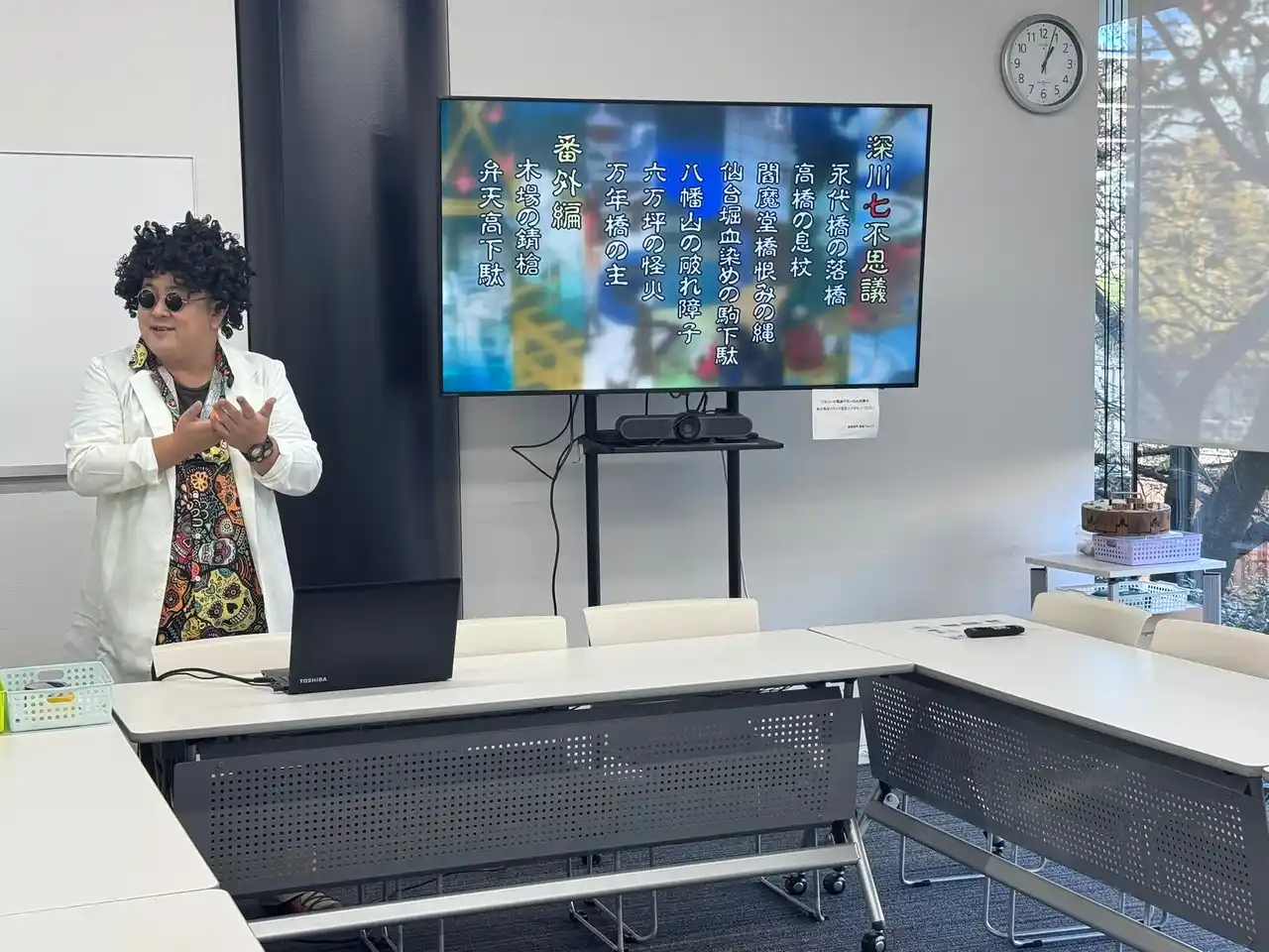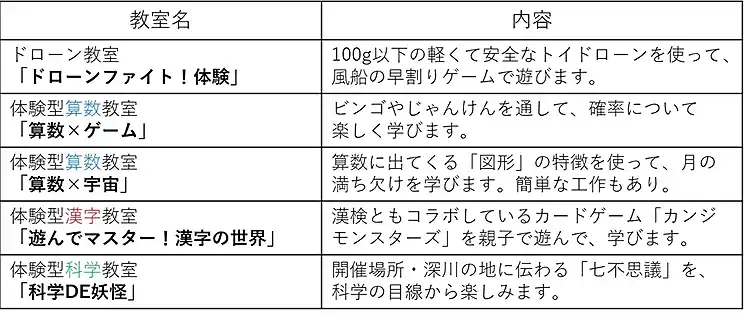 前回の8月に続いて、ドローン・算数・漢字・妖怪をテーマにした5種類の教室を展開し、多様な学びと体験の場を提供しました。今回は新たに、民俗学と科学をミックスさせた「科学DE妖怪」を開講し、妖怪やお化けが好きな子どもたちに向けて、その興味から自然に科学へつながっていけるよう工夫しました。延べ13組/31名の親子にご参加いただき、活発なコミュニケーションを取ることができました。 |