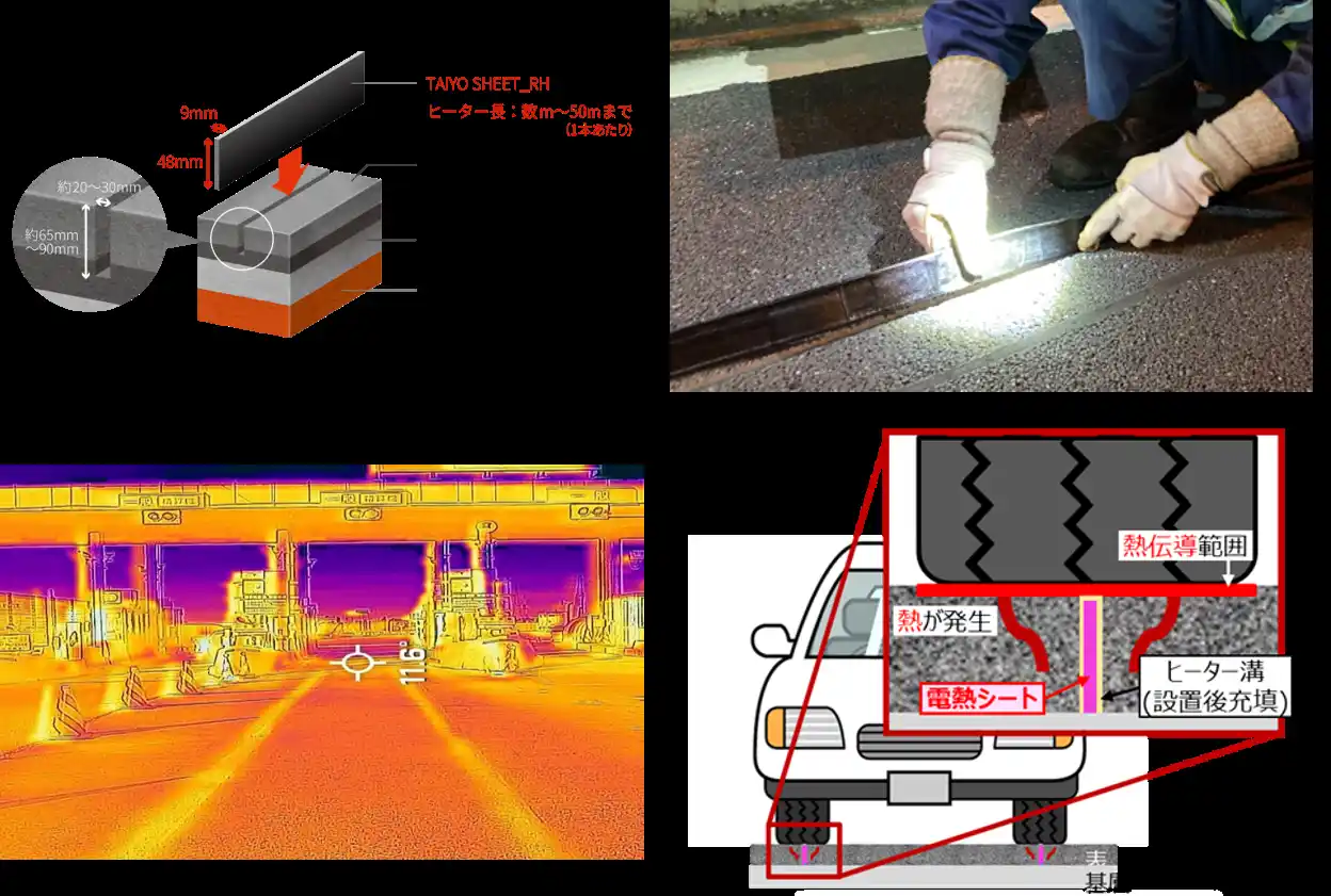 すでに日本各地の高速道路や国道に導入が進んでおり、施工時には「縦入れ工法」によって通行規制時間を大幅に短縮。導入後は雪によるスタックや凍結による交通渋滞・通行止めのリスク軽減に貢献しております。 |