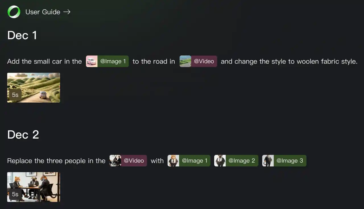Kling O1の使用例。画像や動画をメンションで指定して、指示から動画を作れる |