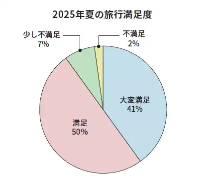 なお、今年の夏の旅行満足度は「満足」「大変満足」を合わせて9割以上と、昨年から引き続き高い結果となりました。キャッシュレス決済の活用や、旅行先や宿泊、移動手段の工夫などをして旅行を楽しまれたかたが多いことがうかがえます。 |