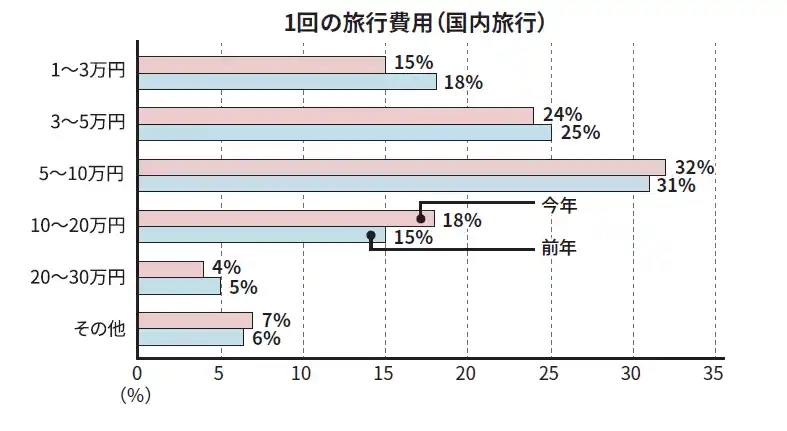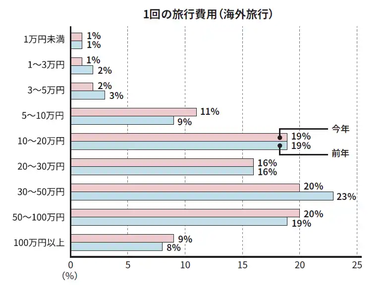 国内旅行費用は、昨年と同様「5~ 10万円」が最多の32% 。海外旅行は、「30~ 100万円」が40%を占め、依然として高額帯の回答が多い結果に。