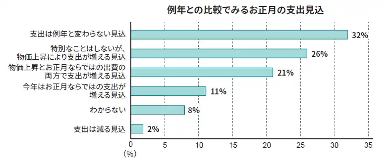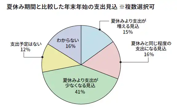 年末年始の過ごし方は、「自宅で過ごす」が最多。年末年始の支出は「夏休み期間より少ない」と見込むかたが約4割いる一方で、例年より「支出が増える」と予想する声は半数以上に。
