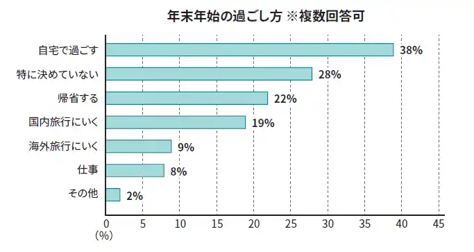 年末年始の過ごし方については、「自宅で過ごす」と回答したかたが38%で最多となり、自宅で年末年始を過ごす予定のかたが多いことがうかがえます。 |