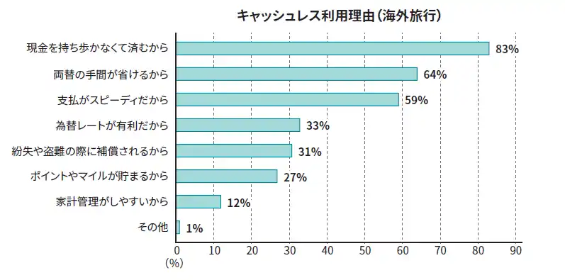 海外旅行先でのキャッシュレス決済の利用は、9割以上にのぼり、国内旅行でも同様の結果となりました。決済手段としては、デビットカードとクレジットカードをメインで利用されたかたが多い結果となりました。海外旅行でキャッシュレス決済を利用した主な理由は、「現金を持ち歩かなくて済むから」が最多となり、安全性に加え、利便性を重視する傾向がうかがえます。 |