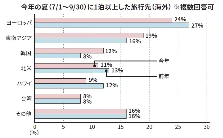 今年の夏に国内旅行をされたかたは81% 、海外旅行は39%に。海外の渡航先はヨーロッパ、北米、ハワイが減少した一方、アジア圏が昨年の32%から39%へ増加し、近距離の渡航先が増加傾向に。