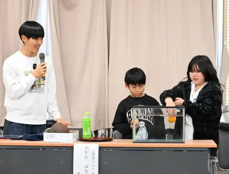 緒方さんの問いかけに、児童たちは大盛り上がり。「かぶの丸い部分、実は『胚軸(茎)』なんだよ」という解説には、教室中から「えーっ!知らなかった!」「ずっと根っこだと思って食べてた!」と驚きの声が上がりました。年齢の近い“お兄さん先生”の豊富な知識と楽しい解説に触れ、児童たちが野菜への興味を深める時間となりました。 |