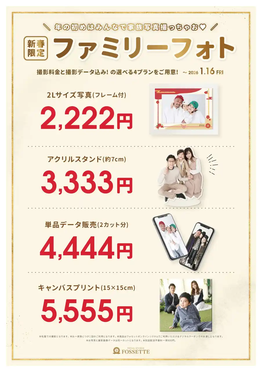 | 株式会社SAホールディングス(本社:広島県呉市、代表取締役:相川真太郎)のグループ会社である株式会社スタジオアイ(本社:同、代表取締役:同)が運営する「トータルスタジオフォセット」では、毎年恒例となる新春キャンペーン「ファミリーフォト2026」を、2026年1月2日~16日(※一部店舗は1日~)の期間で開催し、撮影料金とデータを含めた2,222円~の4種類のお年玉プランを用意します。 | |||||||||