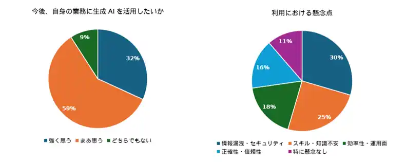 一方で、懸念点として「情報漏洩・セキュリティ」が引き続き上位に挙がっており、環境整備とルールの徹底が継続的な課題であることも示されました。 |