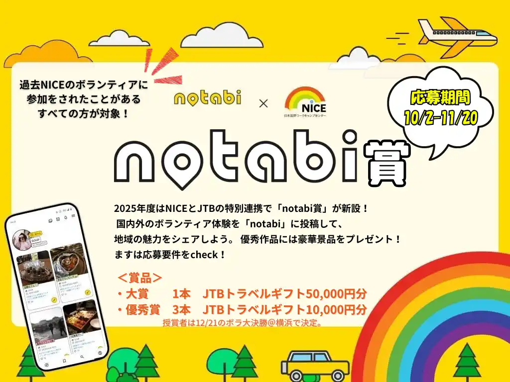 「notabi賞(JTBコラボ企画)」 - 旅行記録アプリ/サービス「notabi」を使って投稿された体験談や記録の中から、地域やボランティア活動の魅力を最も伝えた投稿を投票により授賞者を表彰。JTBとのコラボならではの特別賞です。 |
