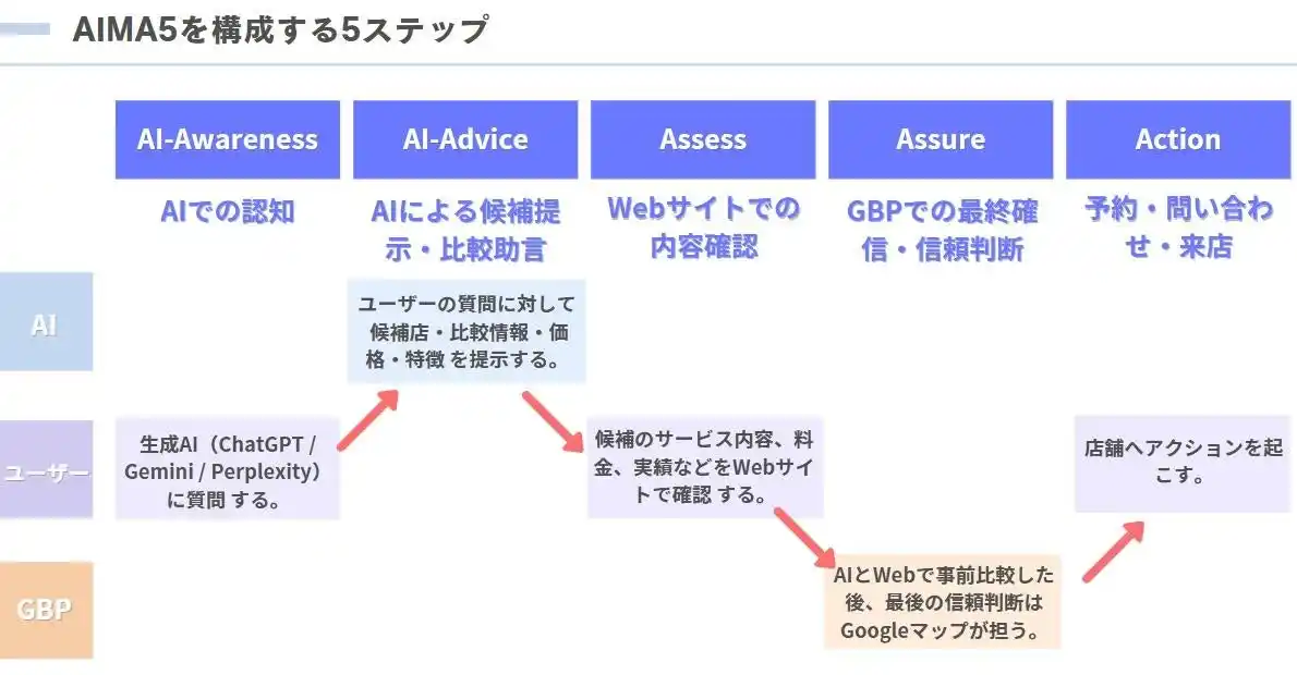 AIMA5は、AI検索での認知から、Webでの比較、Googleマップでの確信、来店・予約までの流れを