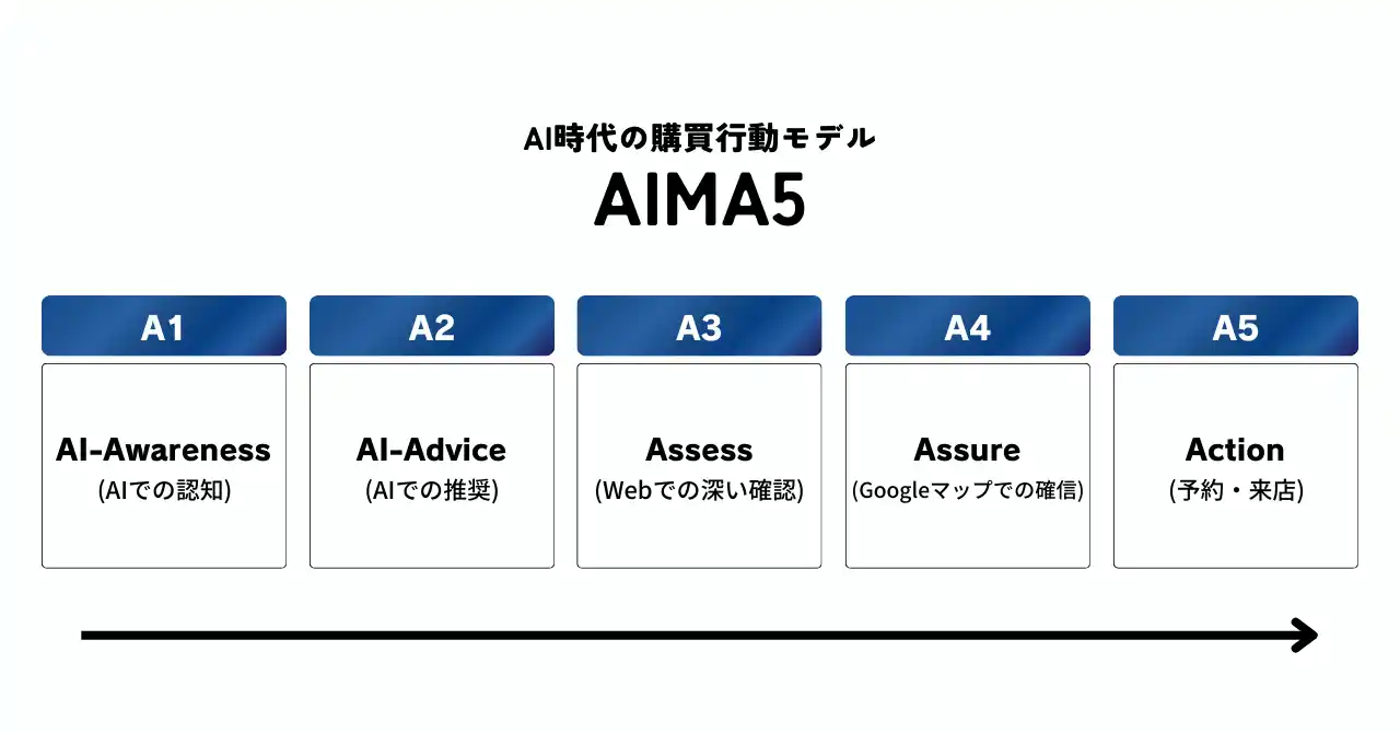 AIMA5は、AI検索・Webサイト・Googleマップ・来店という一連の行動を、5つのステップで整理した購買行動モデルです。消費者がどのように情報と接触し、どのように信頼を高め、最終的に行動へ移るのかを見える化しています。 |