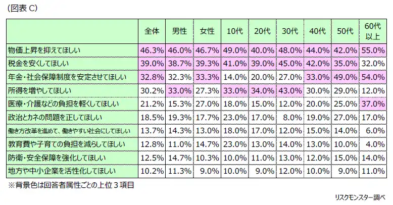 | 「物価上昇を抑えてほしい」は、すべての世代で最多の回答率となっていますが、とくに、低年収とみられる60代以上の年金世代および10代からの関心が高いことがわかります。また、「税金を安くしてほしい」は、子育て世代の30代と40代からの関心が高いことがわかります。さらに、「年金・社会保障制度の安定させてほしい」は、50代以上で高い関心がもたれているなど、世代ごとに異なる生活の不安が反映された結果といえるでしょう。(図表C) | |||||