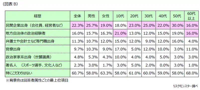| 経歴については、「特にこだわりはない」が60.7%で最多。具体的な経歴では「民間企業出身」(22.3%)が次点にあげられ、現場感覚を持つリーダーへの期待がうかがえます。 | |||||