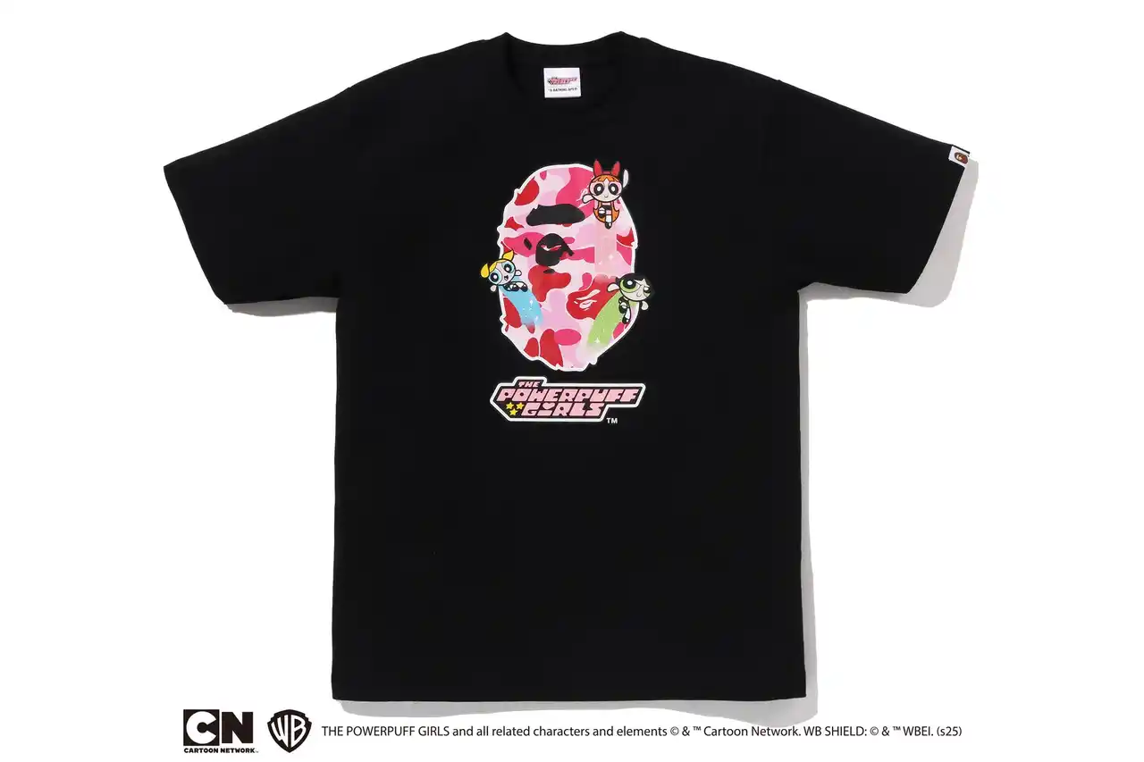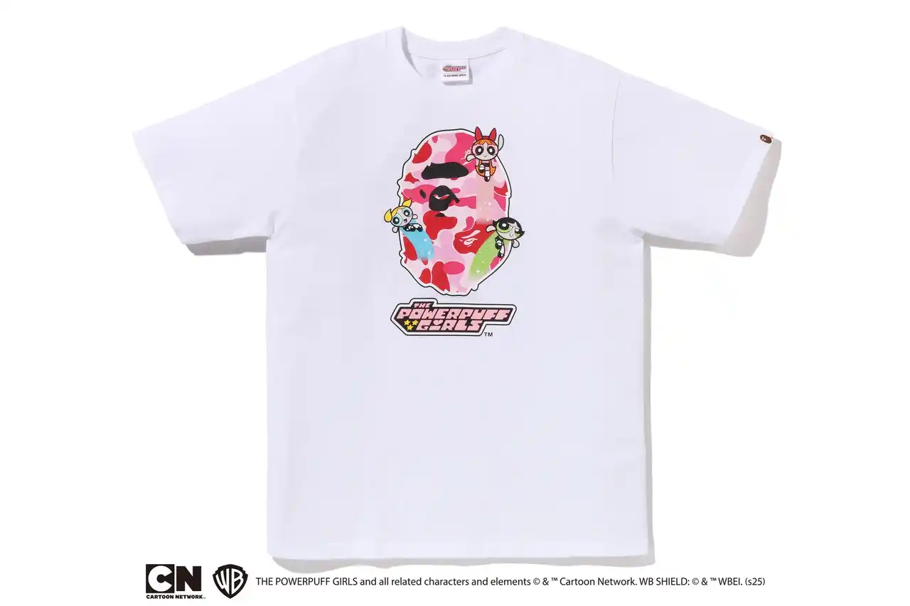 コレクションを象徴するメインモチーフとして、ピンクのABC CAMO柄のAPE HEADにブロッサム、バブルス、バターカップを組み合わせた特別なコラボレートグラフィックを制作。 |