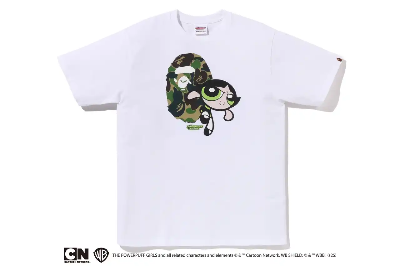 また、ブロッサム、バブルス、バターカップのキャラクターカラーに合わせて、ピンク、ブルー、グリーンのABC CAMOをそれぞれAPE HEADと組み合わせたグラフィックTシャツも登場します。こちらはホワイトのみの展開で、3人の個性を際立たせる1枚に仕上げています。 |