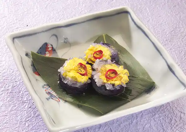 花ずしは、主に秋田県で作られる伝統的な漬物で、なすの中に食用菊や唐辛子、餅米を詰めて漬け込む料理です。色彩豊かで、なすの青、菊の花の黄色、唐辛子の赤が特徴的です。 |