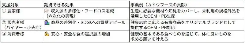 カドウフーズの持つ「規格外野菜を付加価値に変える技術」で、皆様の課題解決と事業の発展を力強くサポートいたします。 |