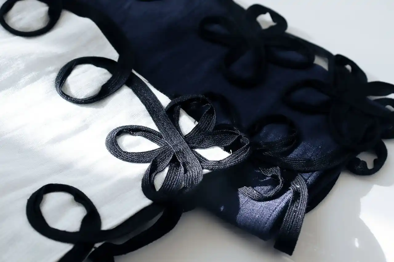 チュールのテープを特殊ミシンで止めつけ、バラが連なって咲いているように見える立体的なデザイン。生地は綿100%のダブルガーゼで柔らかく、アイロン不要。ホワイト、ラベンダー、ベージュ、ブラックの4色の他、グリーンはオンラインのみの限定販売。 |