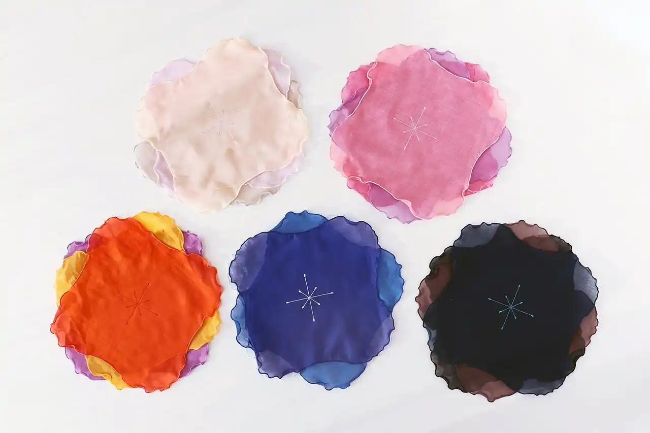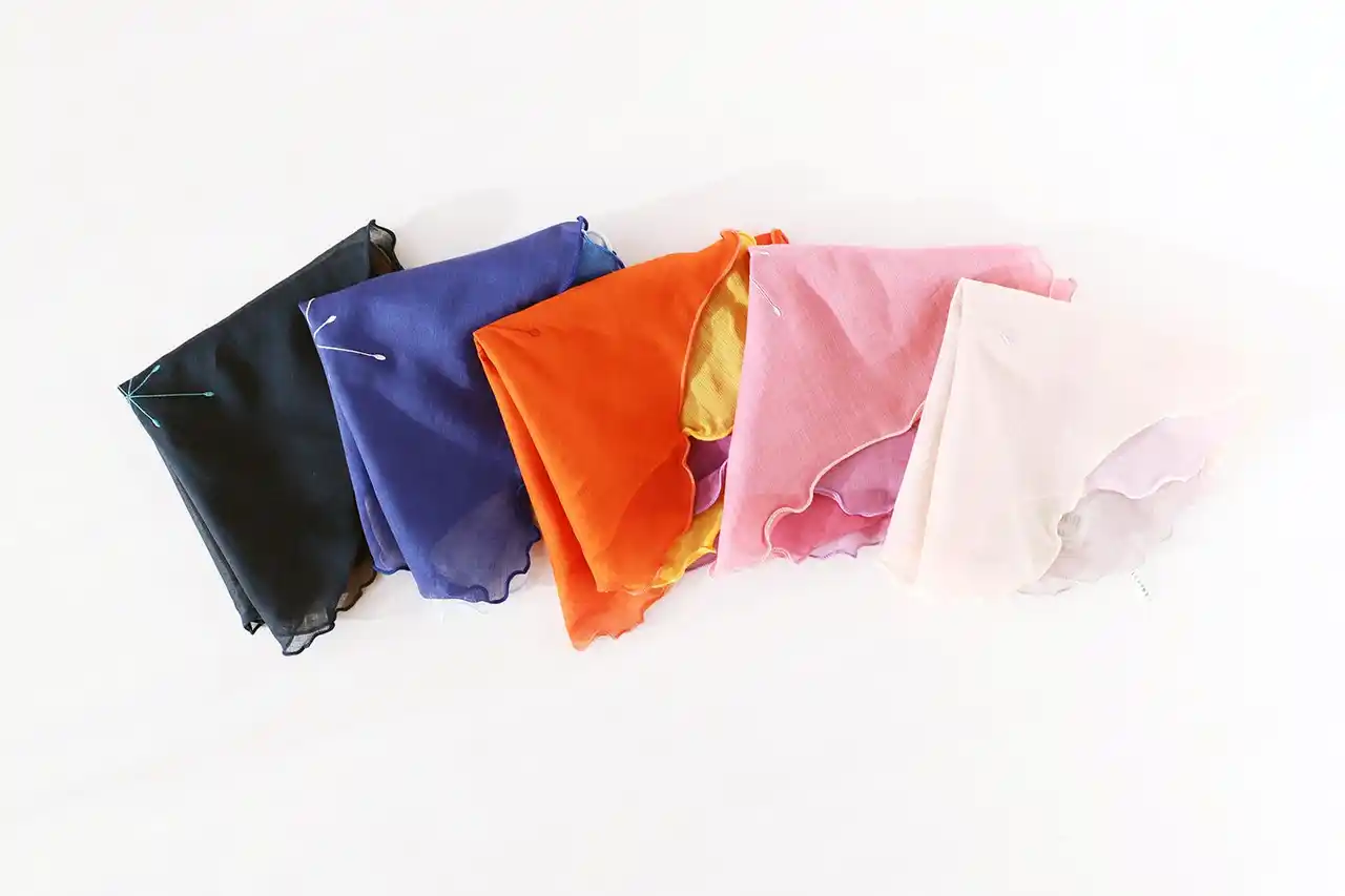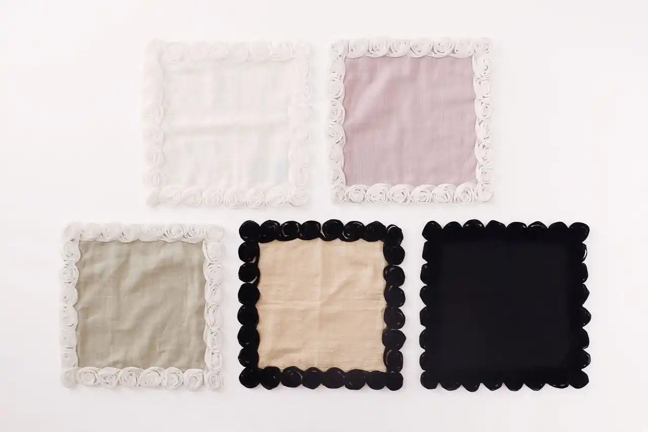 新作の「frillia」シリーズは、ハンカチーフという一枚の布が、「立体」という新たな表現に挑んだシリーズです。バラをイメージしたチュールの刺繍、ギャザーを寄せた贅沢なフリル。重なり合う布が生む陰影と色のグラデーション。一枚のハンカチがこんなにも自由で、新しい景色を見せてくれることに、ハンカチーフの新たな可能性を感じています。Frillia(フリリア)は、frill(フリル)を元にした造語です。実用性や機能性ではなく、新しさや楽しさ、美しさに重きを置いたシリーズとなっています。frillという言葉には、ときに「なくてもよいもの」という意味が含まれますが、その“なくてもよいもの”こそが、心や生き方を豊かにし、自由にすることもあるのだと思っています。 |