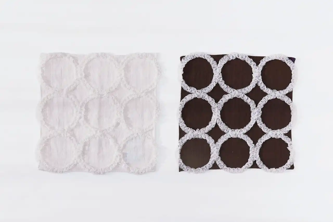 小さなドットが入っているチュールテープを特殊ミシンで9個のリングが並ぶように止めつけました。クシュクシュとしたリングが花のリースのようにも見える立体感のあるハンカチです。ホワイトとブラウンの2色を展開します。 |