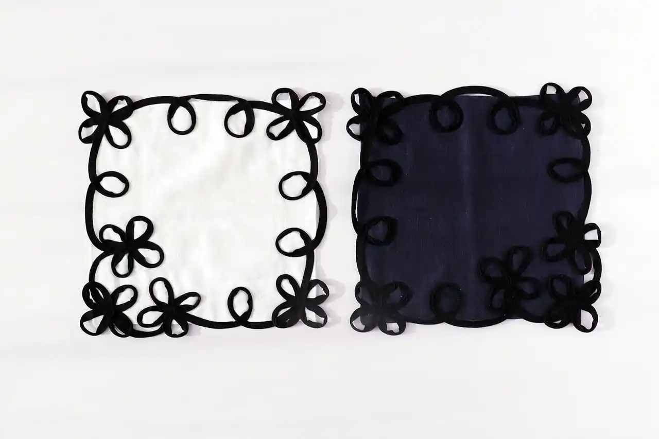 色は白×黒のモノトーン、ネイビー×黒のシックな色合い。ハンカチ本体の生地は綿100%のダブルガーゼ、柔らかくアイロン不要です。 |