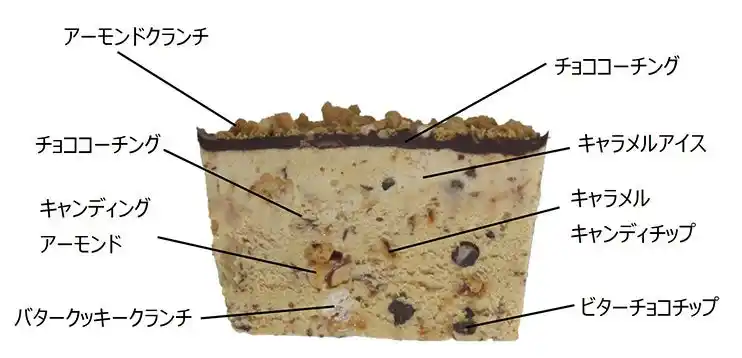 N.Y.C.SANDのこだわりを反映したキャラメルアイスの中には、「キャンディングアーモンド・チョコチップ・キャラメルキャンディチップ・バタークッキークランチ・チョココーチング」の5種類を配合。口に運ぶたび、5種の素材が重なり合って濃密で香ばしいハーモニーが生まれ、ザクサクパリッと多様な食感が心地よく響きます。 |