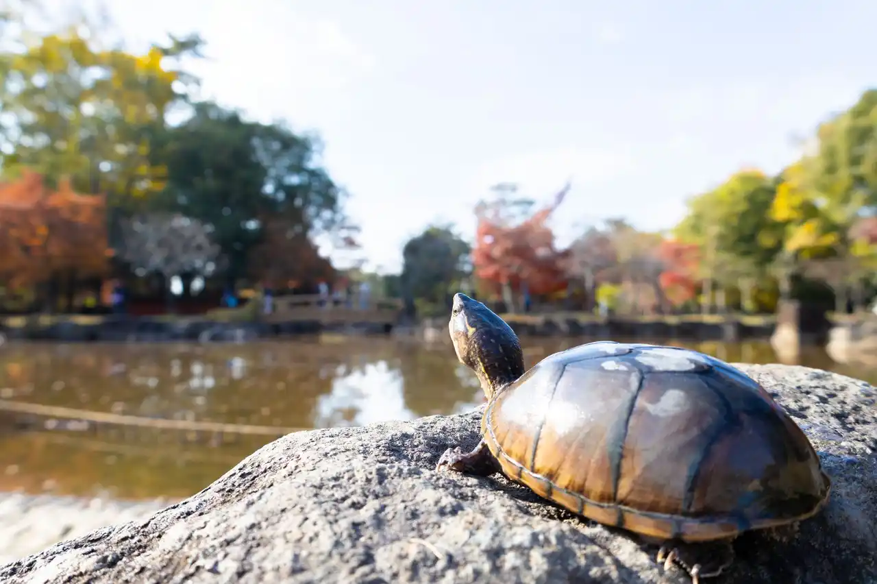 奈良公園にて撮影した(右前)ミシシッピニオイガメ、(後方)フトアゴヒゲトカゲ、(左前)ヨツユビリクガメ |