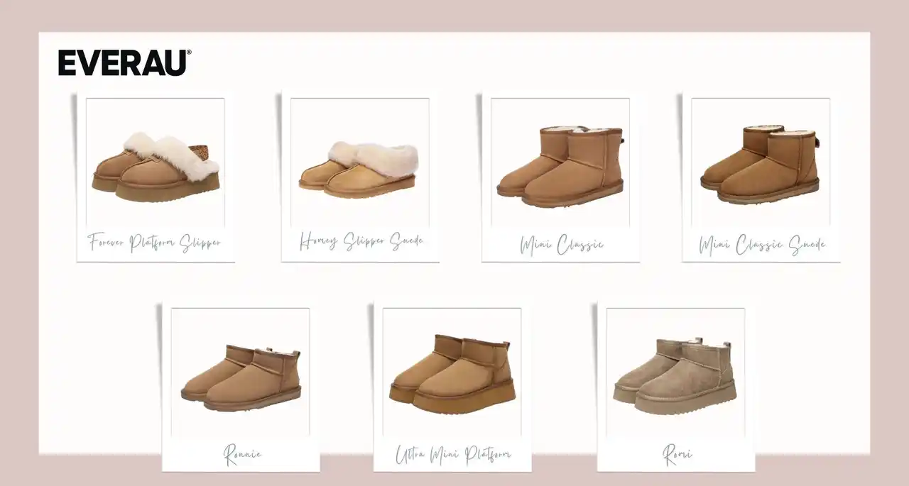 商品はEVERAUを象徴する6つのモデルが登場。クラシックなブーツからリラックス感のあるスリッパ、スタイルアップを叶えるプラットフォームまで、幅広いラインナップで日常のさまざまなシーンに寄り添います。 |