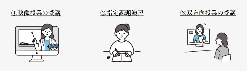 本コースは、「映像配信型授業」と「少人数双方向授業」を組み合わせた講座です。映像配信型授業で知識をインプットしたのち、少人数双方向授業で知識の定着や応用力を確認します。 |
