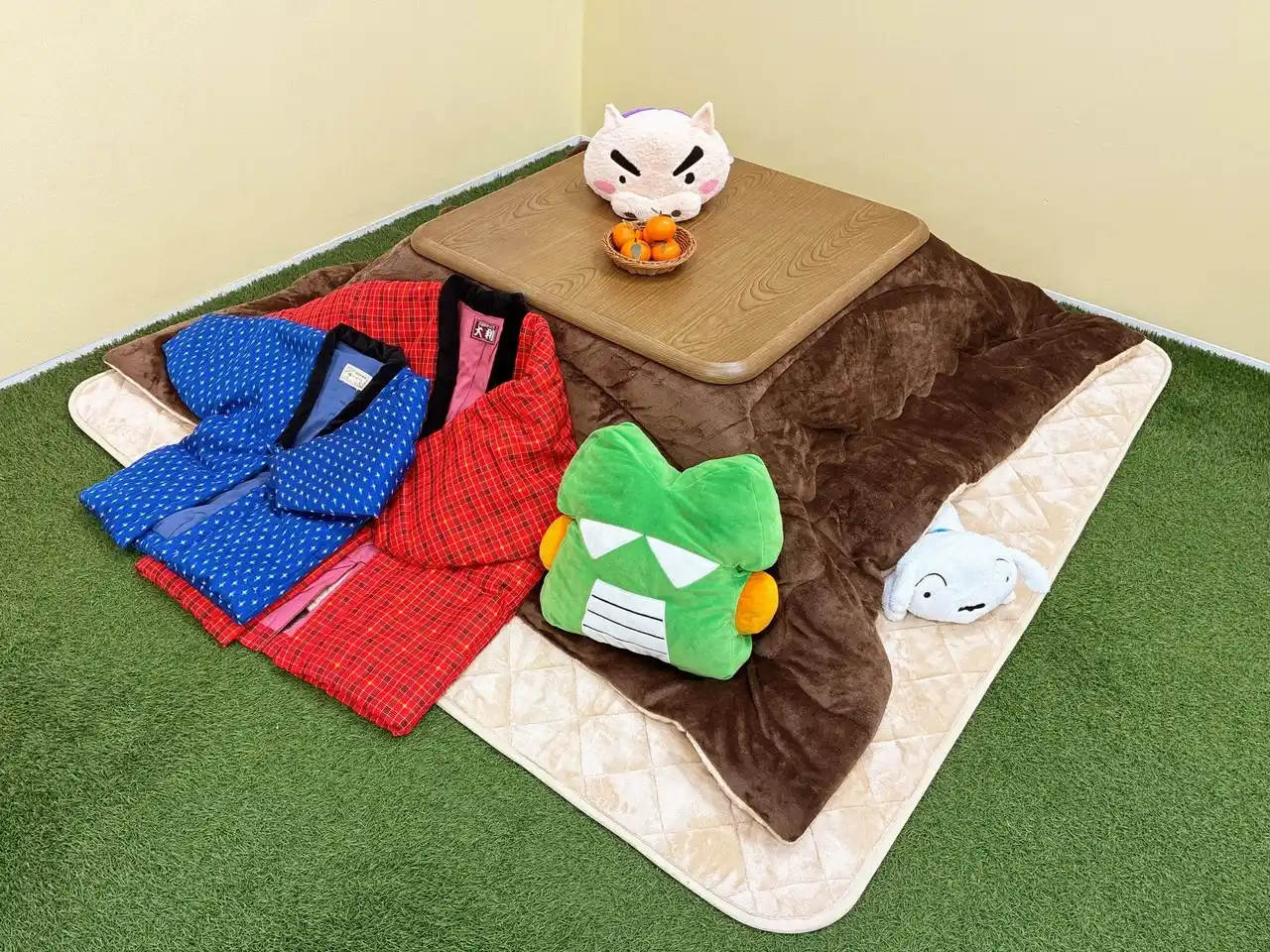 期間中は、あそび場の芝生にこたつを設置し、アニメの作中に登場するお菓子がモチーフの「すごろくチョコビ」のすごろくや、かるたやトランプなどのテーブルゲームを楽しむことができます。冬の風物詩である「こたつ」を囲い、野原一家の気分をお楽しみください。 |