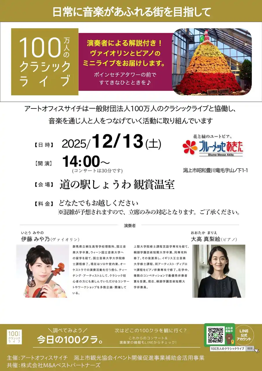 | 製造、建設、不動産、医療・ヘルスケア、物流、ITに特化したM&A仲介を行う株式会社M&Aベストパートナーズ(本社:東京都千代田区、代表取締役社長:齋藤 達雄 以下M&Aベストパートナーズ)と、一般財団法人100万人のクラシックライブ(東京都千代田区、代表理事:蓑田秀策 以下100万人のクラシックライブ)は、12月13日(土)14:00より、道の駅しょうわ(秋田県)にて、クラシックライブを開催することをお知らせいたします。 | |||||||||