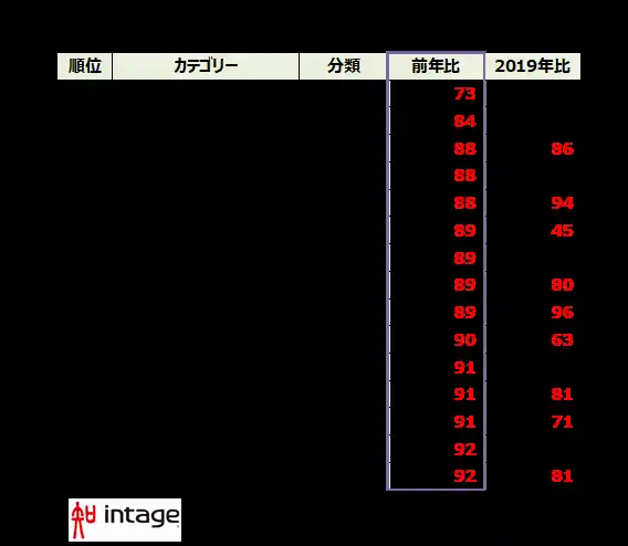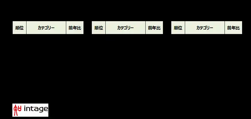 今年は昨年を1つ上回り、食品・飲料が15位までに9つランクインしました、4位の玩具メーカー菓子(118%)は2年連続のトップ10入り。昨今のアニメや漫画人気などのIPコンテンツ需要に乗り、コロナ禍前の3倍近くまで市場は膨らんでいます。7位・ココア(115%)は、機能性に言及した商品が好調でした。昨年4位だった10位・トマトジュース(113%)は引き続き健康志向の高まりや、天候などによりトマトの価格が乱高下する中での代替需要も取り込みました。そして15位は、春雨・くずきり(111%)。今年大ブレイクしたマーラータンの麺としても使われる春雨は、コスパのよさや健康需要にも後押しされ、ランクインしました。 |