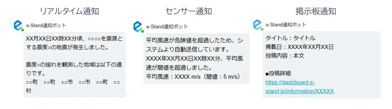 これにより、「e-Stand」が集約する現場の各種センサー情報(降水量・風速など)や地震、警報アラートの通知を、「direct」のトーク画面上で受け取ることが可能となります。普段使い慣れたチャットツールへの通知により、現場職員が異常値を素早く認識し、迅速な対応を行うことができるようになります。 |