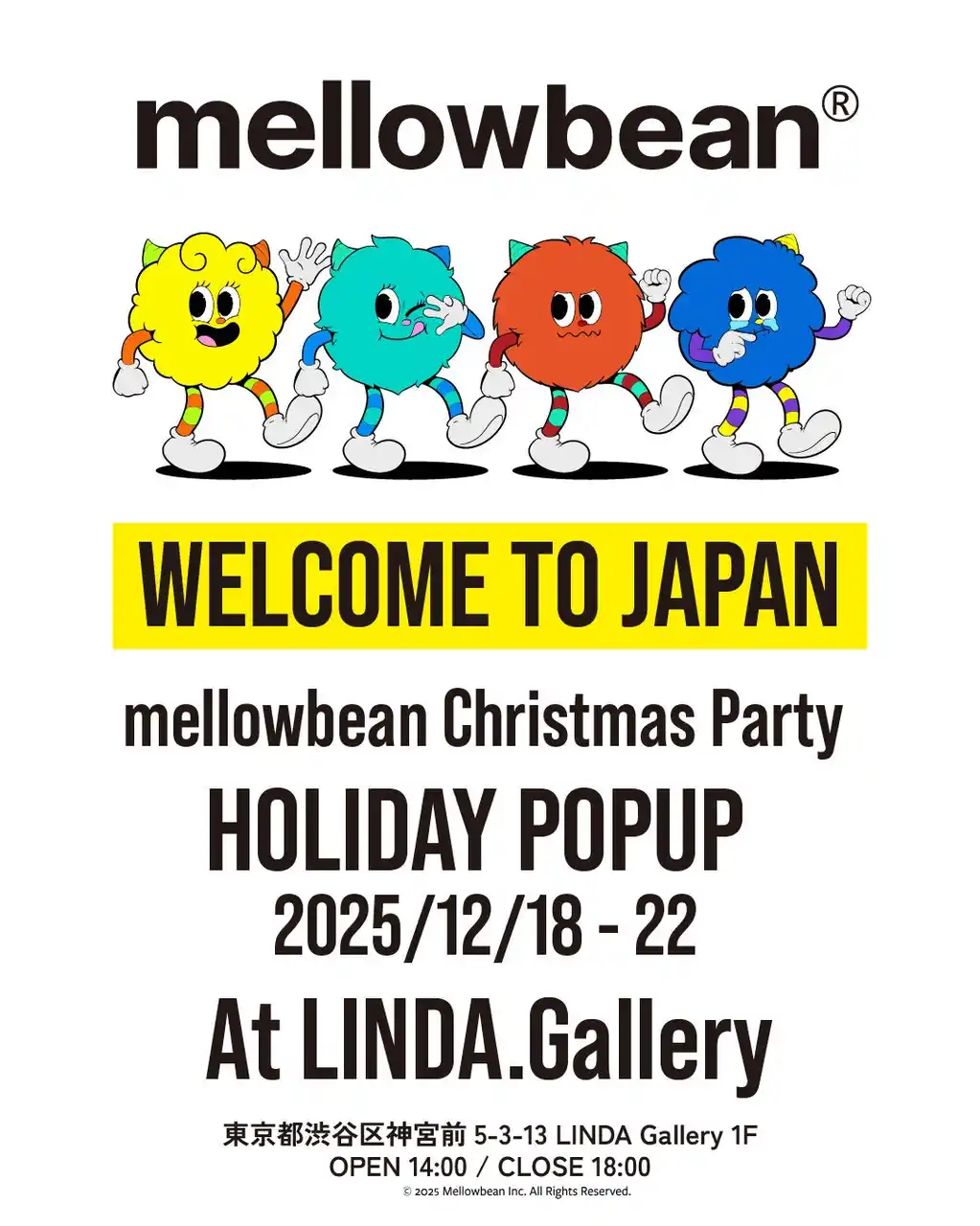 このたび、日本初のお披露目となるポップアップイベント「mellowbean Christmas Party」をホリデーシーズンに開催いたします。キャラクターの世界観をクリスマス仕様で表現したフォトスポットや、韓国で話題の人気商品も登場予定。日本のみなさまにいち早くmellowbeanの世界を体験いただける特別なイベントとなります。 |