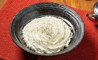 白いクリームが特徴。クリームの下はチーズ、明太子などが隠れており、混ぜて食べると美味しい。だしを加えて味の変化が楽しめる。 |