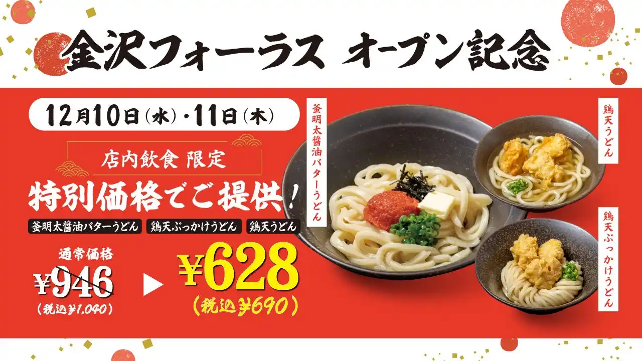 期間中に「山下本気うどん 金沢フォーラス」へご来店いただいたお客様に、釜明太醬油バターうどん・鶏天ぶっかけうどん・鶏天うどんを628円(税込690円)にてご提供いたします。 |