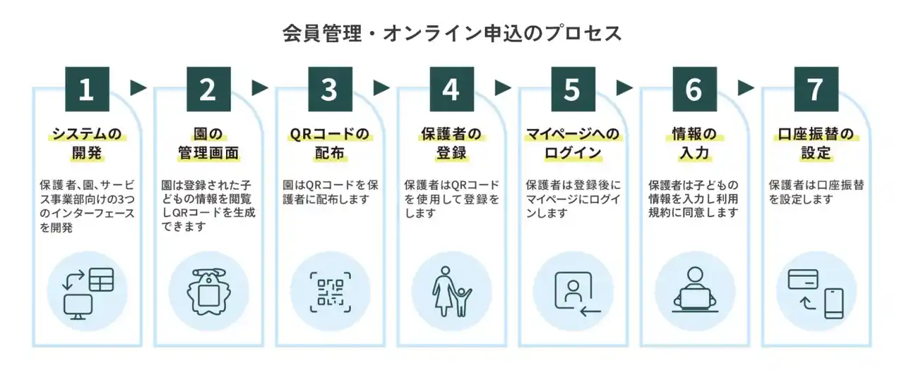 保護者は、子ども情報の登録やサービス利用申込、規約同意、口座振替手続き(印鑑不要)までをオンラインで完結できます。 |