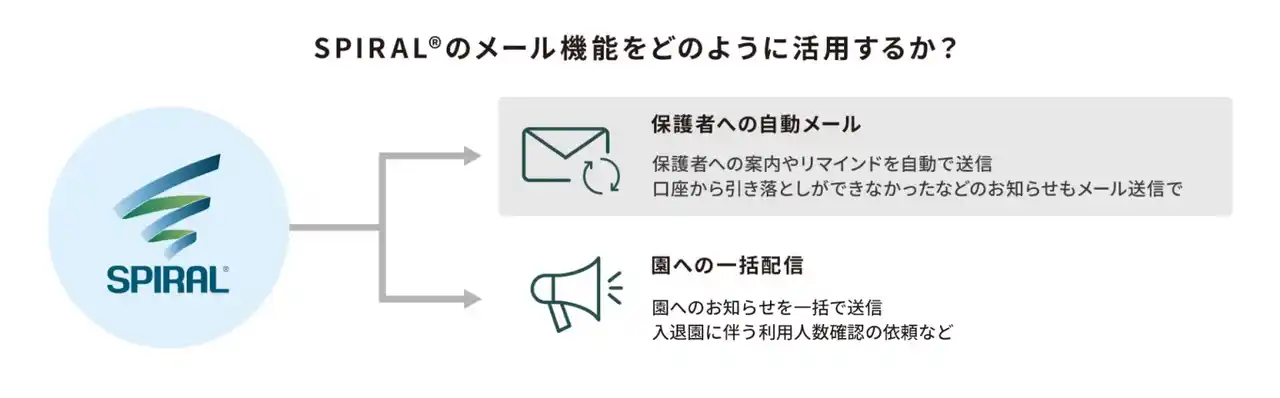 こうした背景から千趣会チャイルドケアは、「申込から情報管理・決済手続きまでの一連業務をオンライン化し、保護者と園、事業部それぞれの負担を軽減できる仕組みが必要である」と考え、システム導入を決定しました。年度切り替え前までという厳しいスケジュール下で、ヒアリング力・提案力・セキュリティ実績が評価され、「SPIRAL ver.1」をご選定いただきました。 |