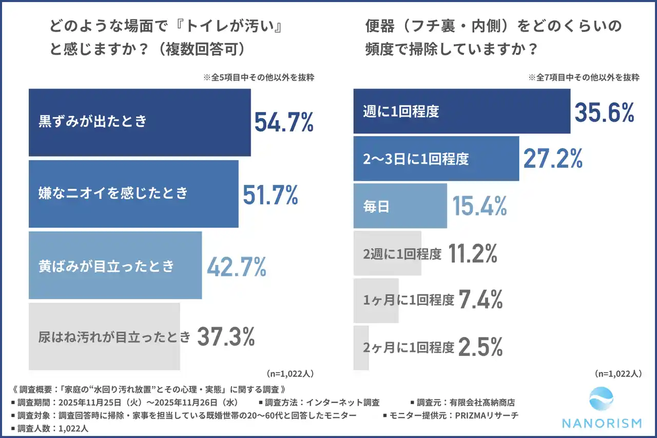 そこで今回、有限会社高納商店(https://takanoh.jp/)は、掃除・家事を担当している既婚世帯の20~60代の方を対象に、「家庭の“水回り汚れ放置”とその心理・実態」に関する調査を行いました。 |