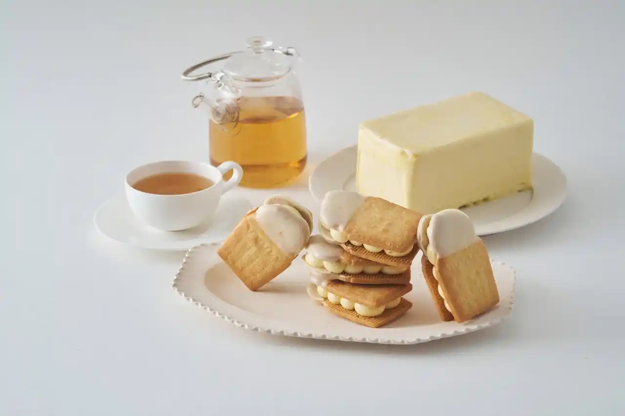 バターのおいしさだけを楽しむお菓子を届けたい。バター好きスタッフの間で、ずっと温め続けてきた企画。"ちゃんとバター、なのに重くない" そんな満足感のある食べ心地と、後味の軽やかさを両立した、重さの残らないバターサンドを目指して完成しました。 |
