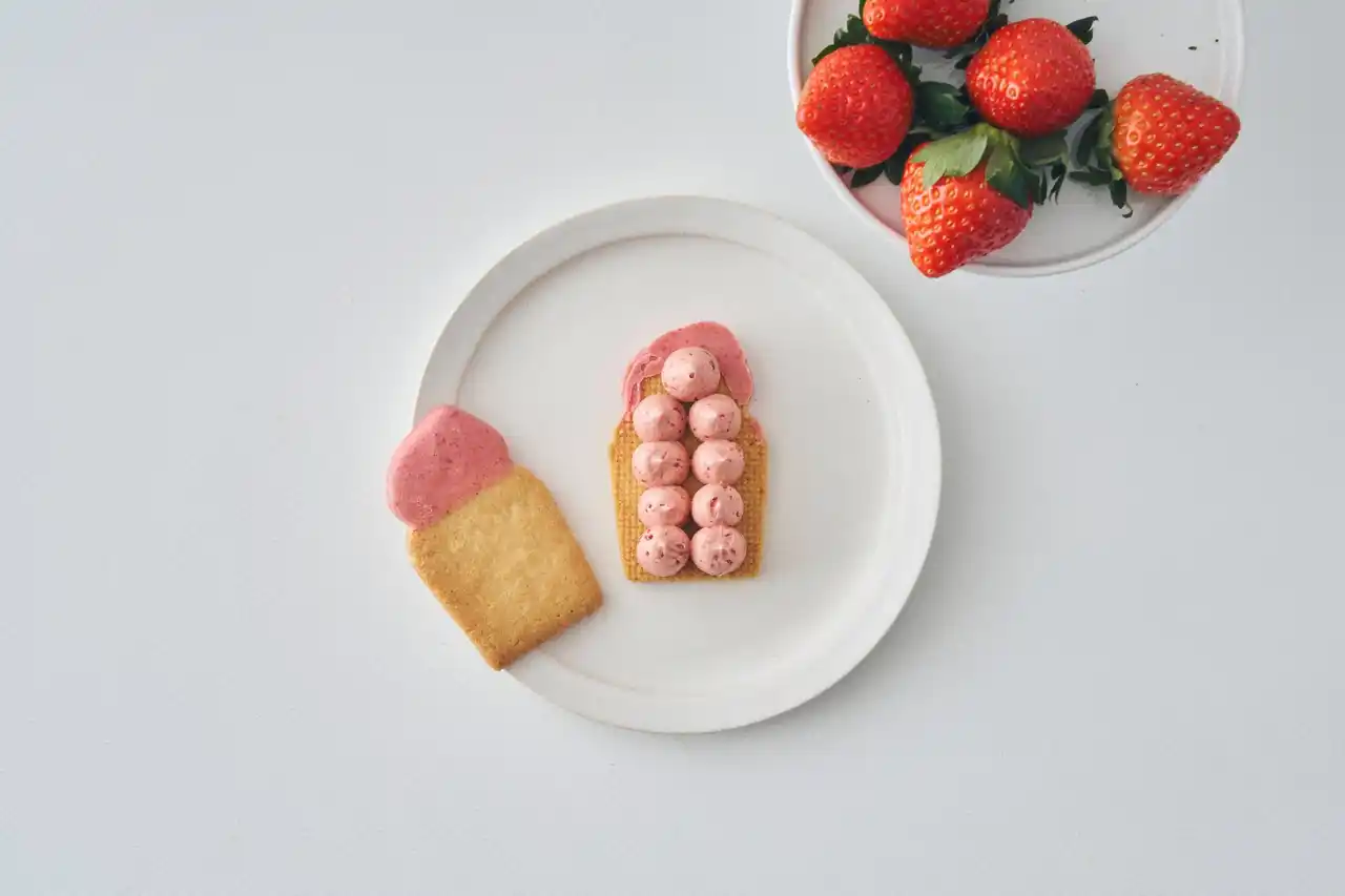 生クリーム入りのバタークリームに甘酸っぱい自家製いちごラズベリージャムを合わせ、いちごチョコレートをかけたビスケットで挟みました。フルーティーでジューシーな味わい。華やかなピンク色の可愛い見た目。さっぱりとしながらも、重厚感のあるミルキーな食べ心地です。 |