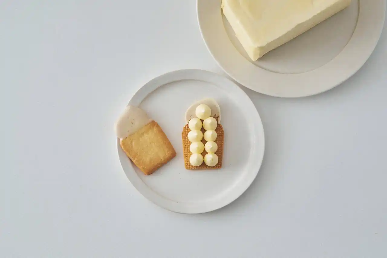 ビスケットには、ホワイトチョコレートをハーフコーティング。チョコの甘みを足すことで、ビスケットの香ばしさと生バタークリームコクをつなぎます。コクとやさしい甘さが寄り添いながら、ビスケットの香りと生バターのミルキーな余韻。最後までバターのおいしさが主役であり続ける、とろけるしあわせをお楽しみください。 |
