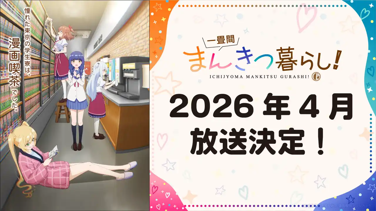 株式会社ブシロード(本社:東京都中野区、代表取締役社長:木谷高明)のグループ会社にあたる株式会社ブシロードムーブ(本社:東京都中野区、代表取締役社長:大貫佑介)は、芳文社「まんがタイムきらら」にて連載中の『一畳間まんきつ暮らし!』(著:ひさまくまこ)のティザービジュアル解禁、公式サイト公開、2026年4月の放送が決定など新規情報を多数公開したことをご案内致します。 |