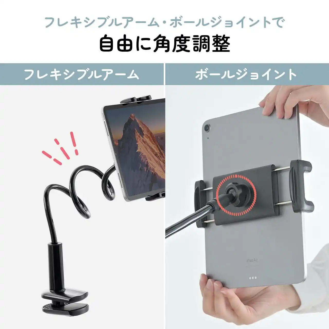 | 本製品は、縦向き、横向きどちらでも取付可能なタブレット・スマートフォン用アームスタンドです。4.7~13インチまでに対応し、挟み込むことで固定できます。 | |||||